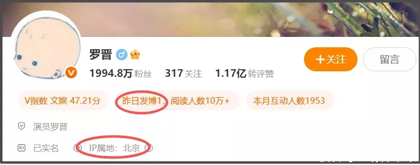 更微妙的是,按照平台IP显示规则,一旦上线更新就会定位到当下IP,唐嫣的账号IP就显示在上海,而罗晋的账号IP则显示在北京,虽然不排除有工作人员上线帮忙转发的可能,但唐嫣工作室的账号IP显示在北京呢。