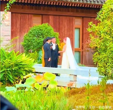 到了婚礼仪式开始,可以看到刘一丝的衣服换成了白色的婚纱。新郎还非常贴心为她整理裙摆。