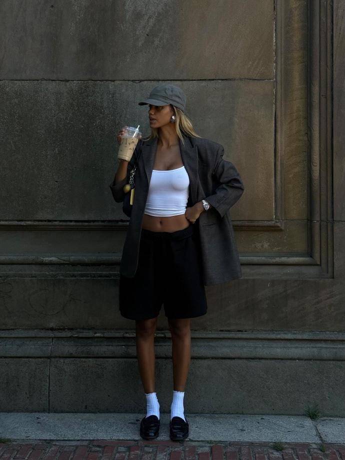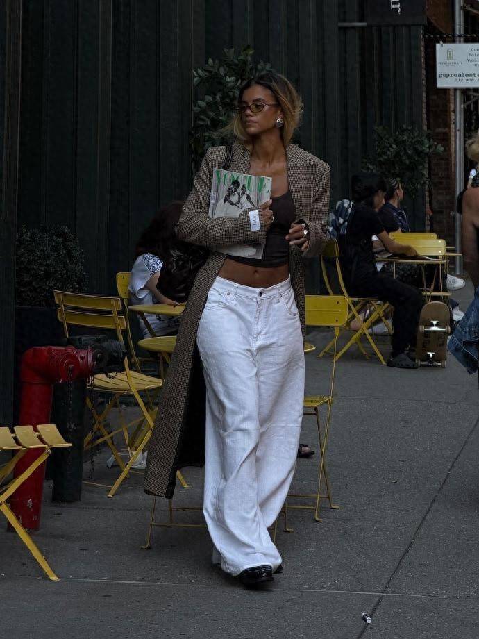 Larissa Jeannew 最擅长的就是 “把基础款穿出新鲜感”,她的穿搭里很少出现小众设计师品牌,更多是白衬衫、直筒牛仔裤、基础款针织衫、oversize 西装这类大家衣柜里都有的单品,但她会通过 “版型组合” 和 “细节调整” 让基础款变出彩。比如她穿白衬衫时,不会规规矩矩地扣到顶,而是解开最上面两颗扣子,再把下摆随意地塞进牛仔裤里,搭配一条细腰带突出腰线,瞬间就摆脱了白衬衫的 “正式感”,多了几分随性的时髦;穿直筒牛仔裤时,她会特意选长度到脚踝的款式,搭配一双露脚背的平底鞋,视觉上拉长腿部线条,就算是微胖身材也能穿出利落感,这种对 “版型细节” 的把控,正是她穿搭显高级的关键。