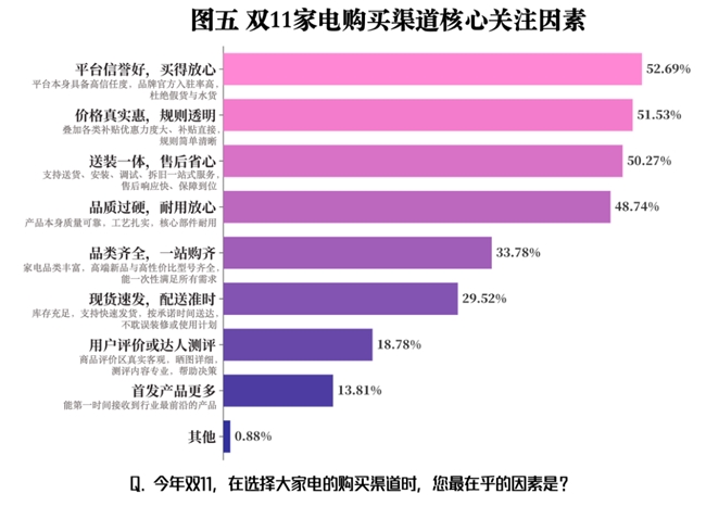 尽管“务实族”与“顶配族”消费理念不同,但在平台选择核心因素上形成高度共识。调研显示,52.69%受访者将“平台信誉好,买得放心”列为首要考量,要求平台具备高信任度、高品牌官方入驻率以杜绝假货;51.53%关注“价格真实惠,规则透明”,希望补贴力度大、规则清晰;50.27%重视“送装一体,售后省心”,期待一站式服务与快速售后响应。
